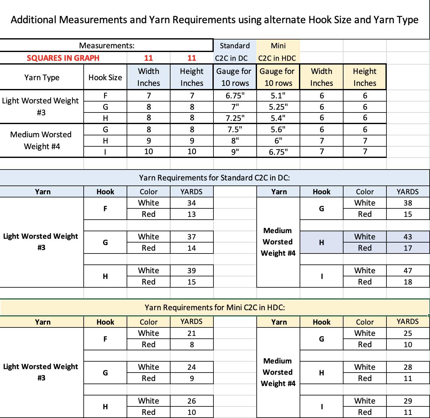 This square is worked using the corner-to-corner (C2C) technique, following the color changes either from the graph or the row-by-row word chart—whichever you prefer!